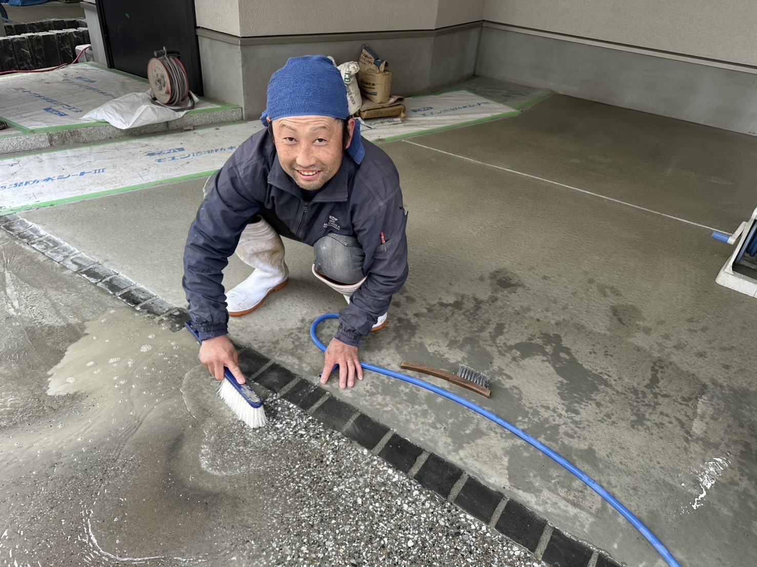 土間コンクリート舗装の洗い出し作業